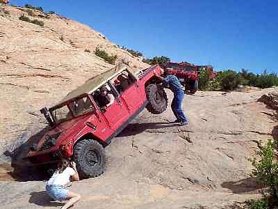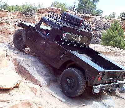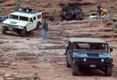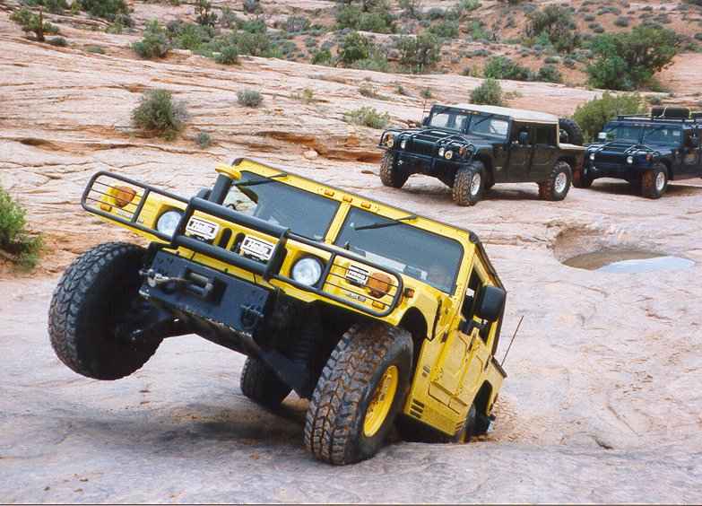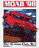 This was a Hummer Club Inc. event. For more info about Hummers join this club and enjoy a great color newsletter as well as participate on trips like this. Call John Sweeney at 818-362-5891 The Hummer Club did a fantastic job of putting this event together. We were all welcomed the first night by a group of organizers that had everything for us. They started by getting us signed in then we picked our trails that we will be going on each day, next was an official Moab98 name tag, and finally they gave us a big bag of goodies. Each bag had your killer Moab98 heavy weight polo style shirt, Moab98 hat, Hummer Club insulated water bottle, Hummer club key chain with a compass built in and a nice box of killer candy. I probably forgot a few other things too. It was so nice to see many of the people Star and I took the Rubicon trip with last August. 3 Hour Video tape available of the event and will have it available