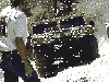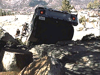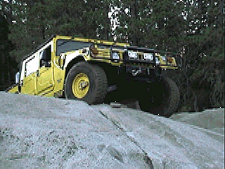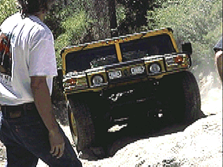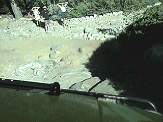 about 100%. It was a great feeling to make it the first time. Well Josh was behind me and as I stopped to video him I noticed he made it easy too. Then I learned Josh has been a hummer owner for quite a while and was no rookie. The last truck was Mike, Sam and Mike's dog J-Dee. They were doing good in the hole and coming out we heard this loud raspy noise that was proportional to engine speed. Well it turned out the Metal fan was hitting the fan shroud. Almost all the Hummers have plastic fans and now I see why. Well it was an easy fix to remove the bad piece and realign the shroud and we were on our way. Again I got it all on video and the noise sounded much worst than it was. We continued on and went over many rocks and narrow paths that left