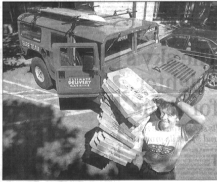 Pizza Hummer: Chuck Hammers holds pizzas that his drivers deliver in this